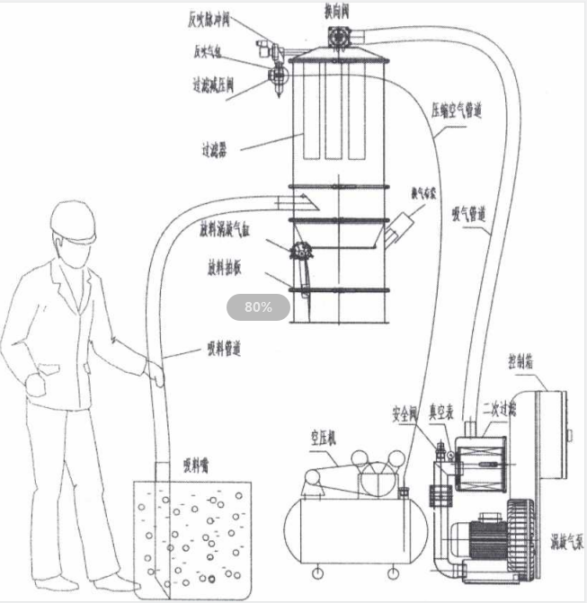 真空加料機中裝有壓縮空氣反吹裝置,每次放料時,壓縮空氣脈沖反吹過濾器,把吸附于過濾器表面的粉末打落下來,以保證吸料能正常運行。