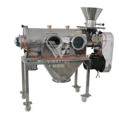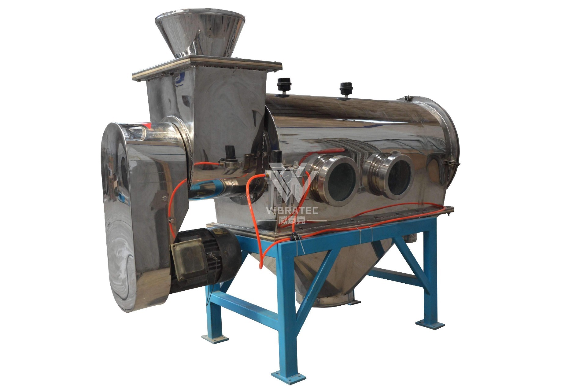 WQS氣流篩的篩網為圓筒狀,置于機體內,物料通過螺旋輸送系統后,與氣流混合、霧化進入網筒內,通過網筒內風輪葉片的高速旋轉使物料同時受離心力和旋風推進力,從而使物料噴射過網,過網的物料由細料出料口排出,不能過網的物料沿網筒壁從粗料出料口排出,達到快速分離的目的。